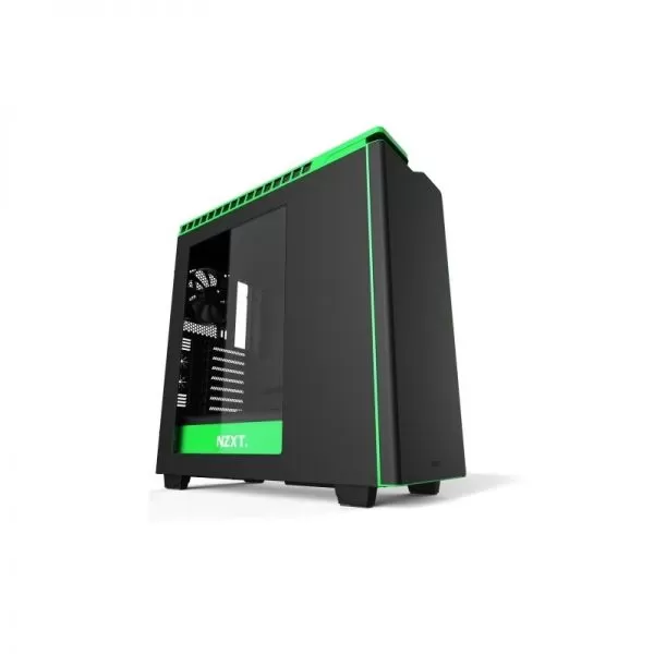 NZXT H440 Matte Black/Glossy Green Trim, SECC Steel ATX Mid Tower, fara sursa, captusita cu material fonoabsorbant, interior vopsit negru, 8x3.5”/2.5” (intern), design tool-less, fata – 3x 120mm fan (FN V2, inclus) sau 2x 140mm fans (optional), spate – 1x 140mm fan (FN V2, inclus) sau 1x 120mm fan (optional), tavan – 2x 140mm fans (optional) sau 3x 120mm fans (optional), 2x USB 3.0, 2x USB 2.0, 1x Audio/Mic, 1x control lumini, ATX / microATX / Mini-ITX, sloturi expansiune: x7, inaltime maxima cooler procesor: 180mm, lungime maxima placa video: 294mm (cu cusca hard disk montata) sau 406.5mm (fara cusca hard disk montata), suport radiatoare water cooling: fata – 2x 140mm sau 3x 120mm, tavan – 2x 140mm sau 3x 120mm, spate – 1x 140/120mm, filtre de praf incluse, dimensiuni: 220 x 510 x 475.3mm