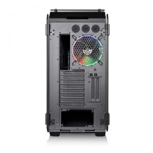 Thermaltake View71 Tempered Glass RGB Edition, SPCC Steel E-ATX Full Tower, fara sursa (tip ATX, montata jos), interior vopsit negru, fata – 1x 140mm Riing RGB fan (inclus) si 1x 140mm fan (optional) sau 3x 120mm fans (optional), spate – 1x 140mm Riing RGB fan (inclus) sau 1x 120mm fan (optional), tavan – 3x 120/140mm fans (optional), podea – 2x 120mm fans (optional), 2x USB 3.0, 2x USB 2.0, HD Audio, E-ATX / ATX / Micro ATX / Mini-ITX, design premium cu panouri laterale din sticla securizata, sloturi expansiune: x8+2, inaltime maxima cooler procesor: 190mm, lungime maxima placa video: 310mm (cu suportul de HDD montat) / 410mm (fara suportul de HDD), lungime maxima sursa: 220mm (fara ventilator podea montat), suport radiatoare water cooling: fata – 1x 360/420mm / interior dreapta – 1x 360/420mm / tavan – 1x 360/420mm / podea – 1x 240mm / spate – 1x 120/140mm, dimensiuni (HxWxD): 592x274x577mm, greutate: 19.1kg