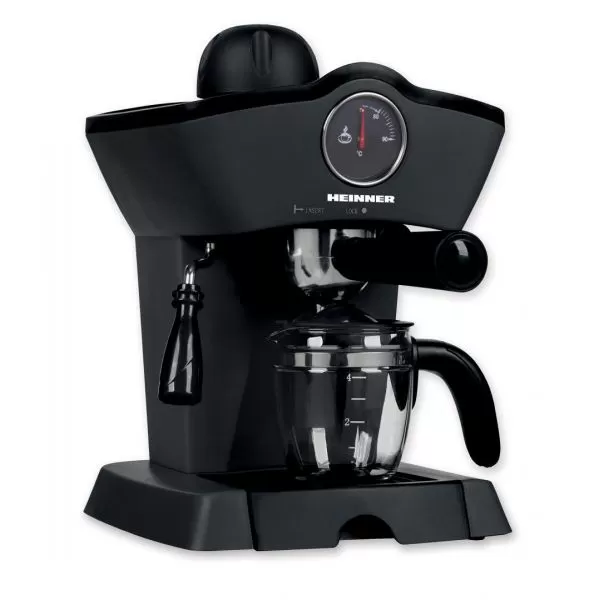 Espressor Heinner HEM-200BK,putere: 800 W, capacitate rezervor detasabil transparent : 250 ml, presiune pompa: 3.5 bar, termometru frontal pentru apa, optiuni preparare: espresso si cappuccino, tavita de scurgere detasabila, boiler din aliaj de aluminiu, filtru pentru 4 cesti de cafea, culoare: negru