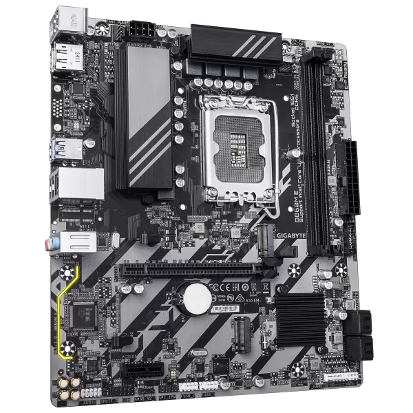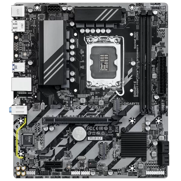 GIGABYTE B860M E. Processor manufacturer: Intel, Processor socket: LGA 1851 (Socket V1), Compatible processor series: Intel Core Ultra (Series 2). Supported memory types: DDR5-SDRAM, Maximum internal memory: 128 GB, Memory slots type: DIMM. Supported storage drive interfaces: M.2, PCI Express 4.0, SATA III, Supported storage drive types: HDD & SSD, RAID levels: 0, 1, 5, 10. Maximum resolution: 4096 x 2160 pixels. Ethernet interface type: Gigabit Ethernet, LAN controller: Realtek RTL8111H