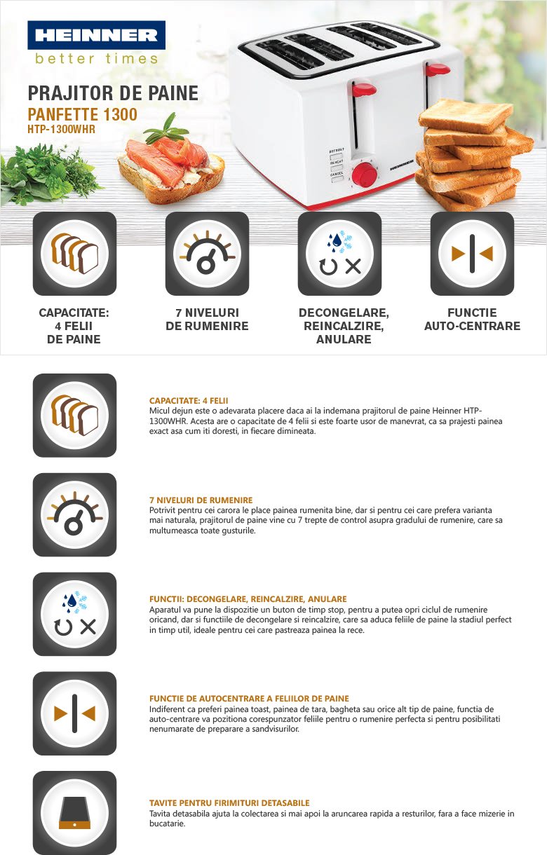 | Caracteristici Prajitor de paine Heinner HTP-1300WHR, 1300W, Alb/Rosu: | |