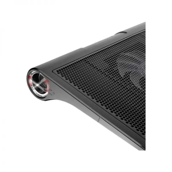 Thermaltake Massive SP, structura din plastic si mesh metalic, dimensiune notebook: 17” (maxim), ventilator silentios de 140mm LED (800-1300 RPM, 54.11 CFM, 1.37 mm-H2O, 29 dBA, control turatie ventilator, buton ON/OFF pentru LED-urile ventilatorului), include 2 boxe stereo, 2 porturi USB, alimentare prin portul USB, design anti-alunecare, dimensiuni: 387 x 282 x 57 mm, greutate: 950g