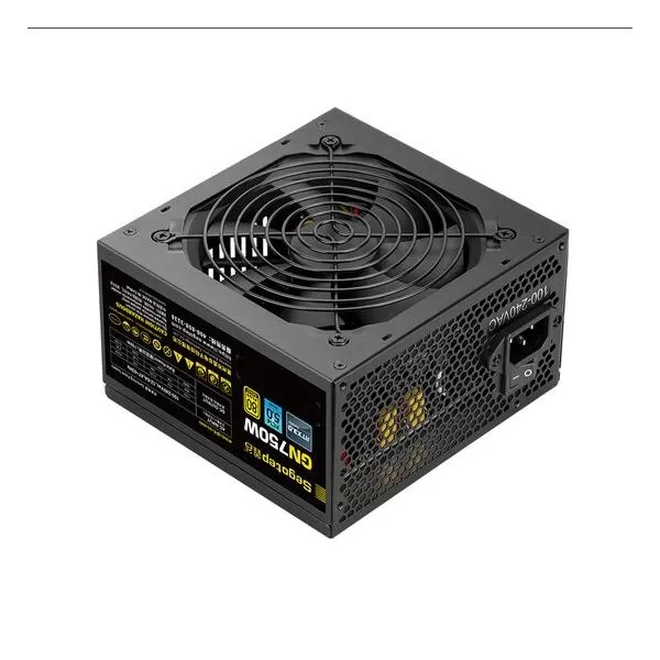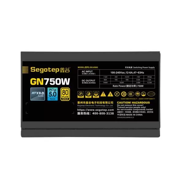 Sursa Segotep GN750W 750W neagra, certificata 80 PLUS Gold, ATX3.0, PCIe 5.0, eficienta 92.5%, single rail (62A), ventilator silentios de 120mm cu control termic automat, 1x 12pin PCIe 5.0, 4x 6+2pin PCIE, 6x SATA, 5x Molex, 2x 4+4pin EPS12V (lungime 680mm) 1x 24pin (lungime 620mm), protectii SPD/OVP/OCP/SCP/UVP/OPP/OTP, Active PFC, dimensiuni: 150x140x85mm, greutate: 2.3Kg